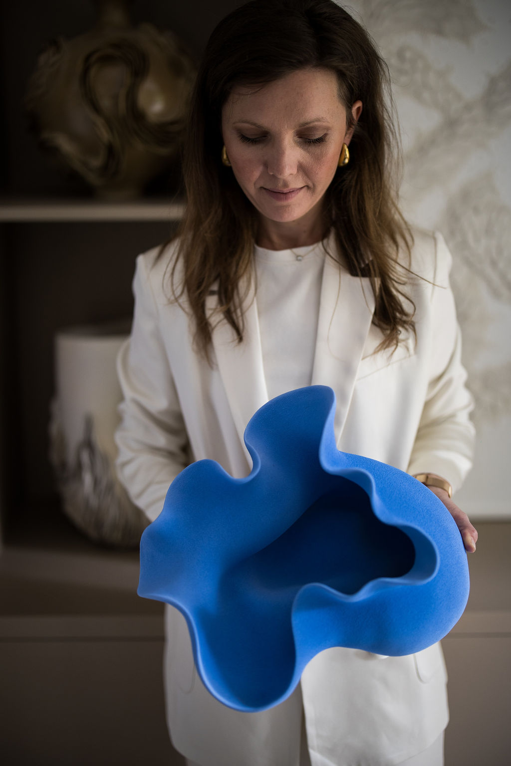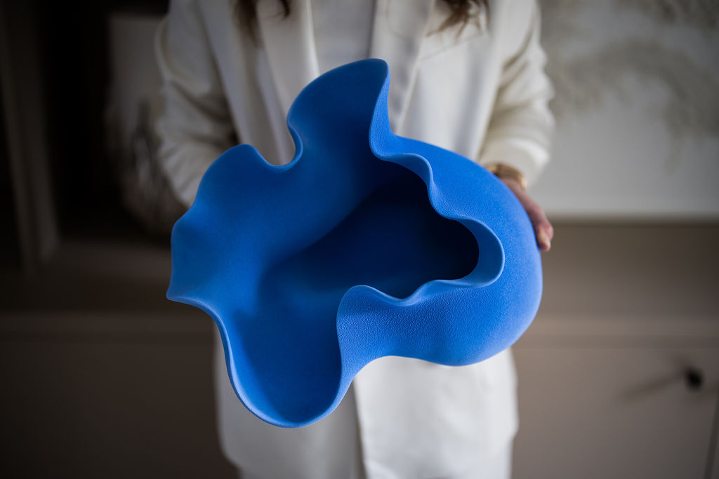 Blue klein ceramic by belgian artist Liliane Demeester. Liliane Demeester is captivated by the dynamic nature of clay, which can be perfectly malleable one moment and resistant the next.